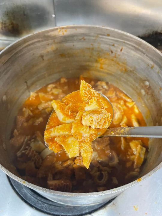 トリッパの塊を香味野菜と一緒にコトコトと。