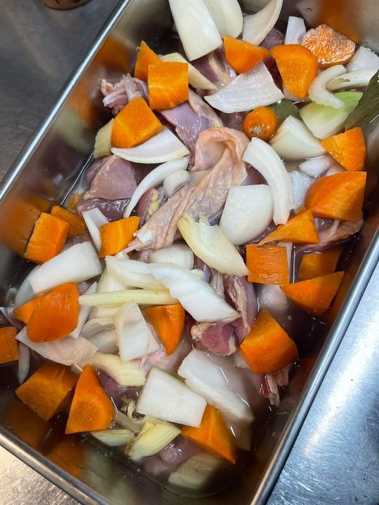 写真はそんな親鶏のワインと香味野菜への漬け込み。