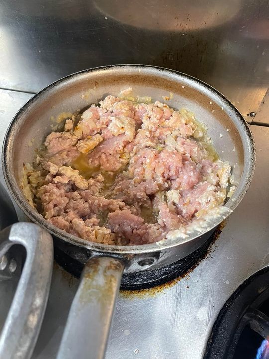 写真はランチパスタソースの仕込み、鶏ひき肉のラグービアンコ(トマトのはいらない白いミートソース)です。