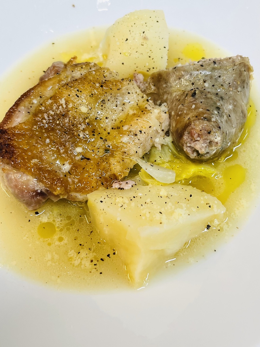 大山鶏と自家製ソーセージのローストスープ仕立て。